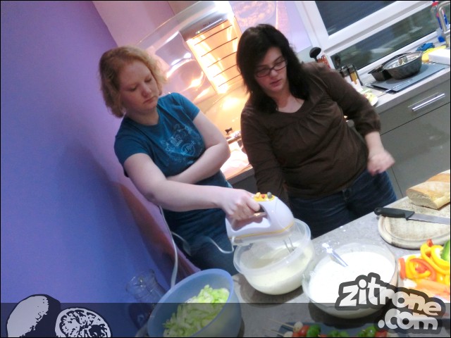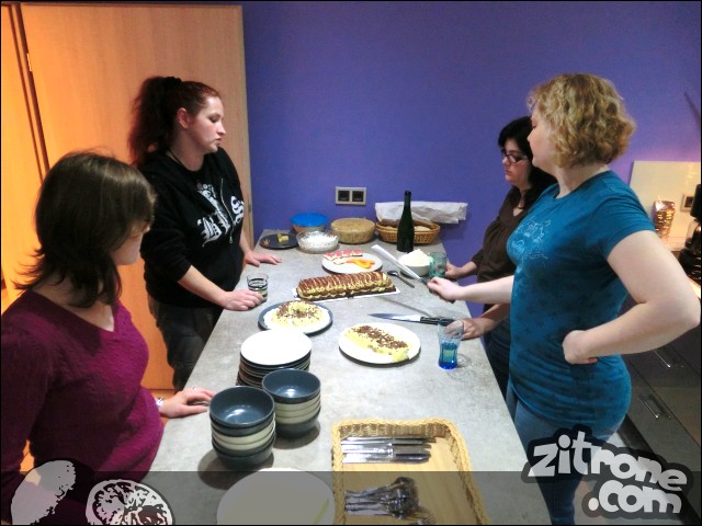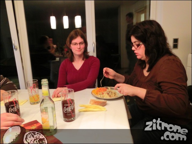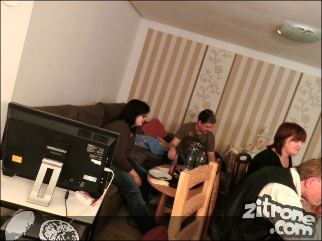 Neben Cati, die bereits seit Mittag da ist, um Manu bei den Vorbereitungen zu helfen, sind auch Lolo, Yvonne, Achim, Sonja, Marco und Dannys Familie, unter anderem Mutter Anne und Schwester Doreen, zur heutigen Doppelfeier eingeladen. Zum Essen gibt es leckere Schnitzel- und Nudelpfannen, Häppchen und jede Menge Naschereien wie Marmorpudding und Tiramisu. Und Achim führt den Gästen eine seiner Lieblings-Apps auf seinem Handy vor: "ZombieBooth"! Diese Software wandelt Fotos von Leuten in animierte Zombiebilder um, einschließlich passender Grölgeräusche. Hier ein gut gelungenes Beispiel (leider nur als Standbild): Lolo als Zombie!
